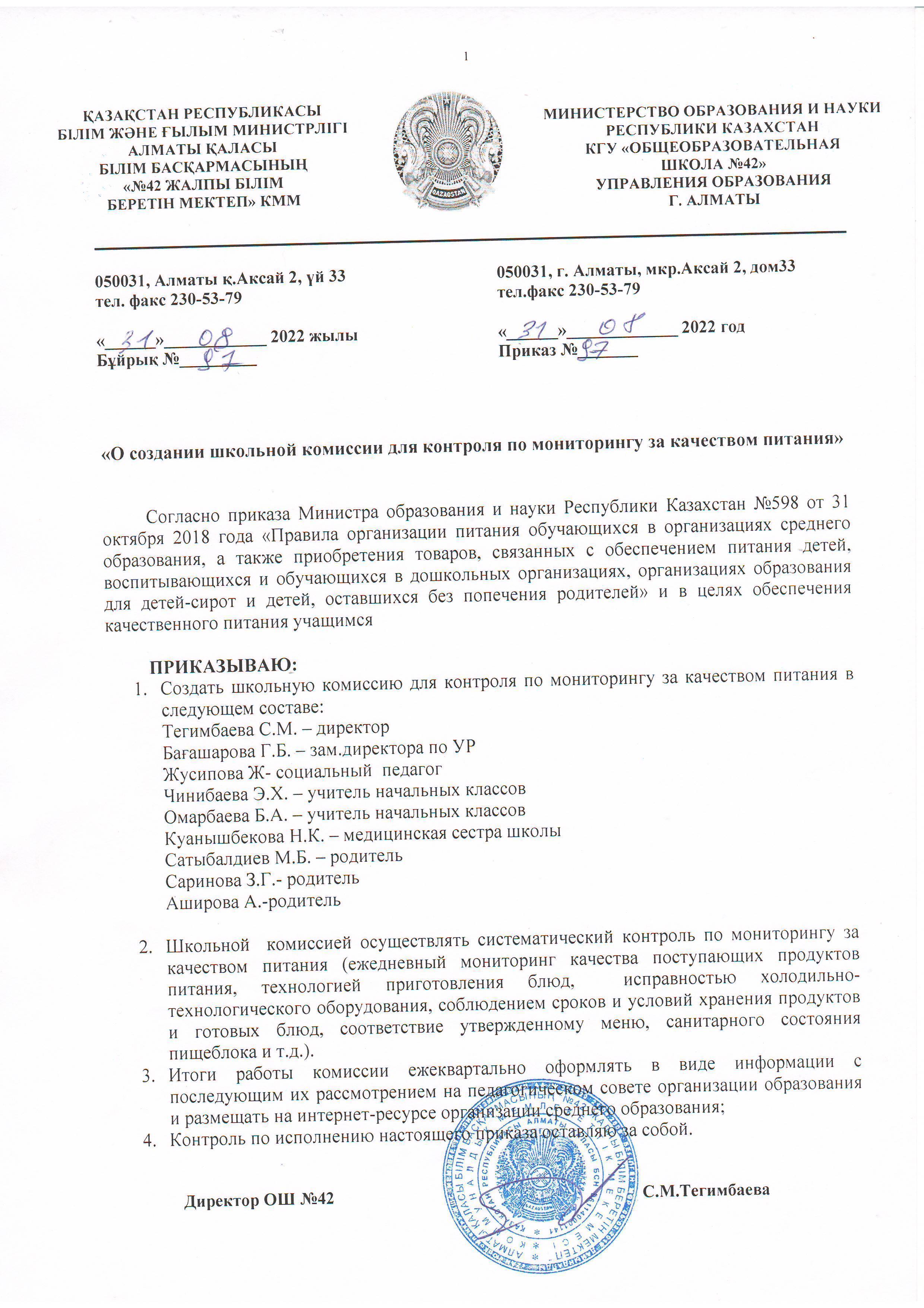 02 қыркүйек 2022 0 1 2 3 4 5 "О создании школьной комисии для контроля по мониторингу за качеством питания"