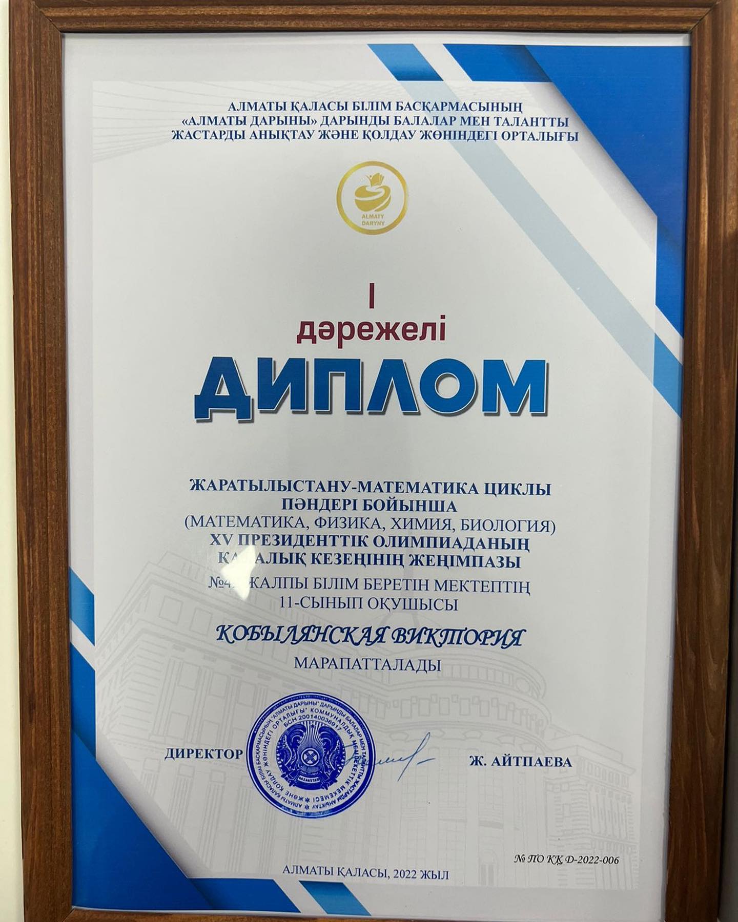 Алматы Қаласының Білім Басқармасының "Алматы Дарын" Дарынды Балалар Мен талатты Жастарды Анықтау Және Қолдау Жөніндегі Орталығы. Жаратылыстану-МАтематика Циклы пәндері бойынша (Математика,Физика,Химия,Биология) ХV Президенттік Олимпиаданың Қалалық Кезеңнің Жеңімпазы №42 Жалпы Білім Беретін Мектептің 11-сынып Оқушысы Кобылянская Виктория 1-дәрежелі дипломмен марапатталды. Құттықтаймыз...