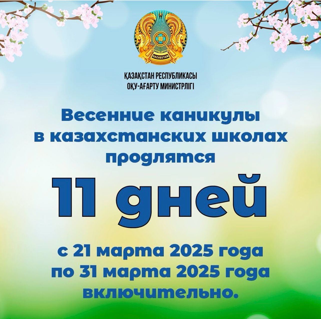 Көктемгі каникул кезінде оқушылар 20-31 наурыз аралығында 12 күн демалады.