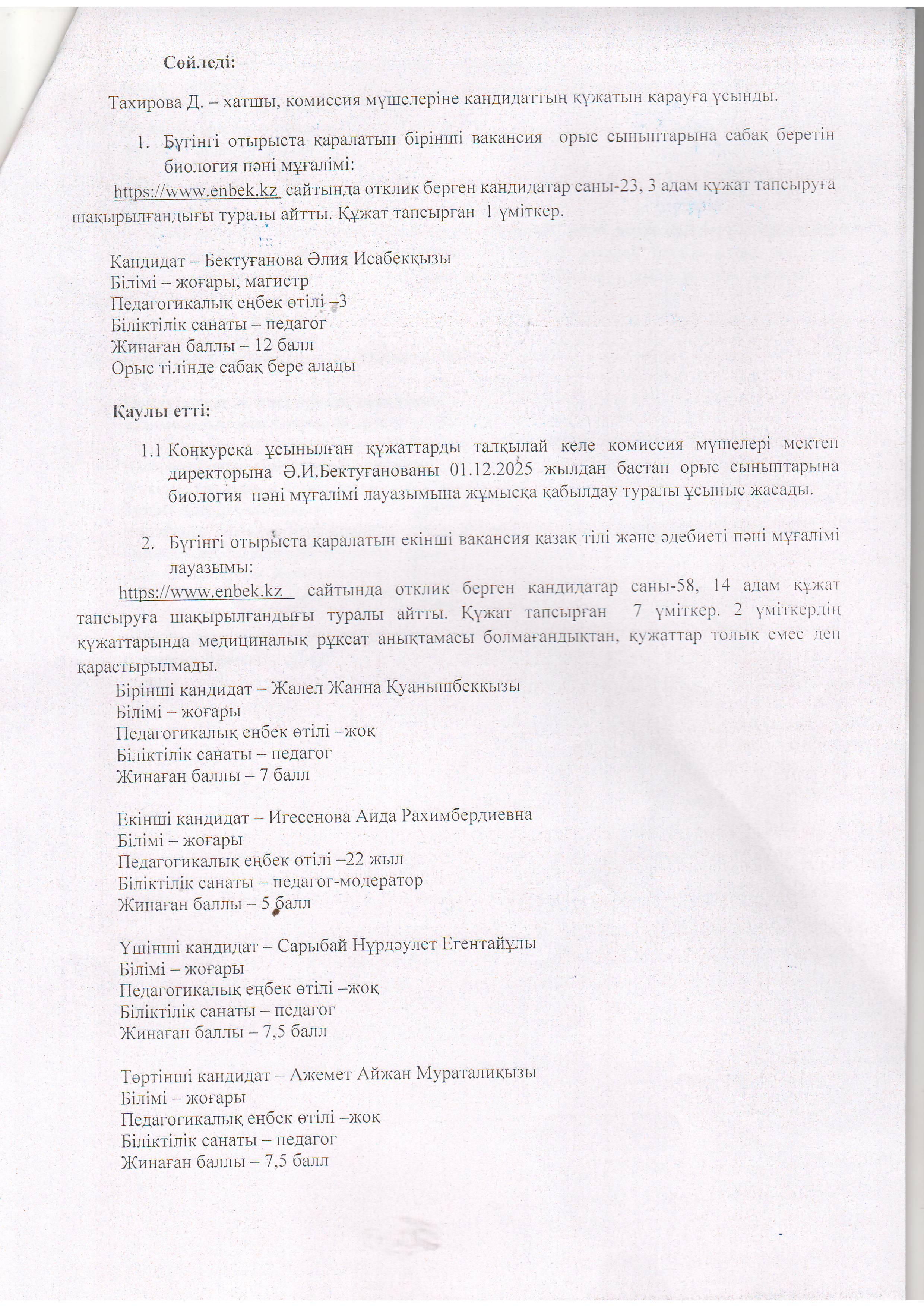 Конкурстық комиссия отырысының №4 хаттамасы