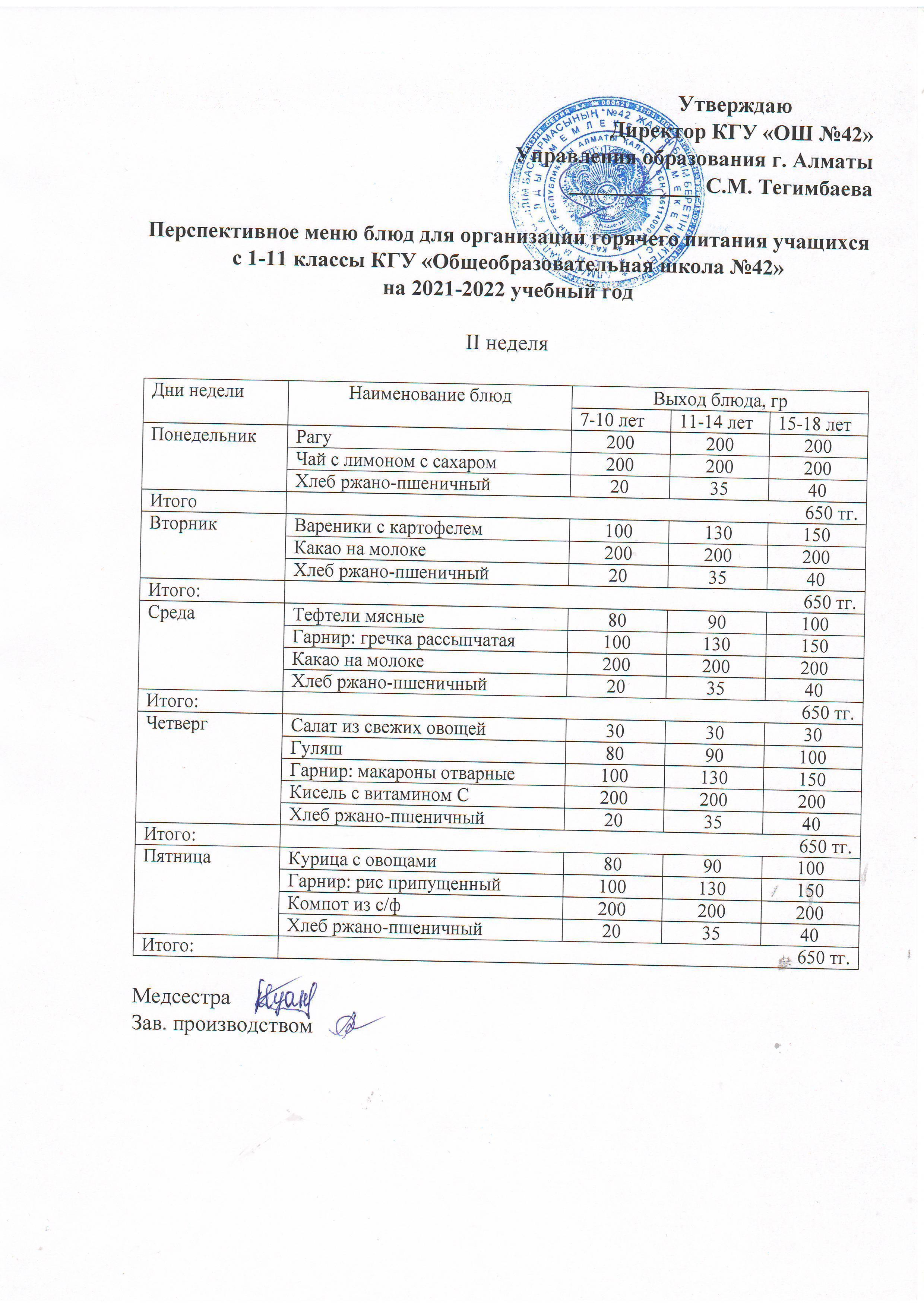 11 қаңтар 2022 0 1 2 3 4 5 Перспективное меню блюд для организации горячего питания учащихся с 1-11 классы КГУ "Общеобразовательная школа №42" на 2021-2022 учебный год
