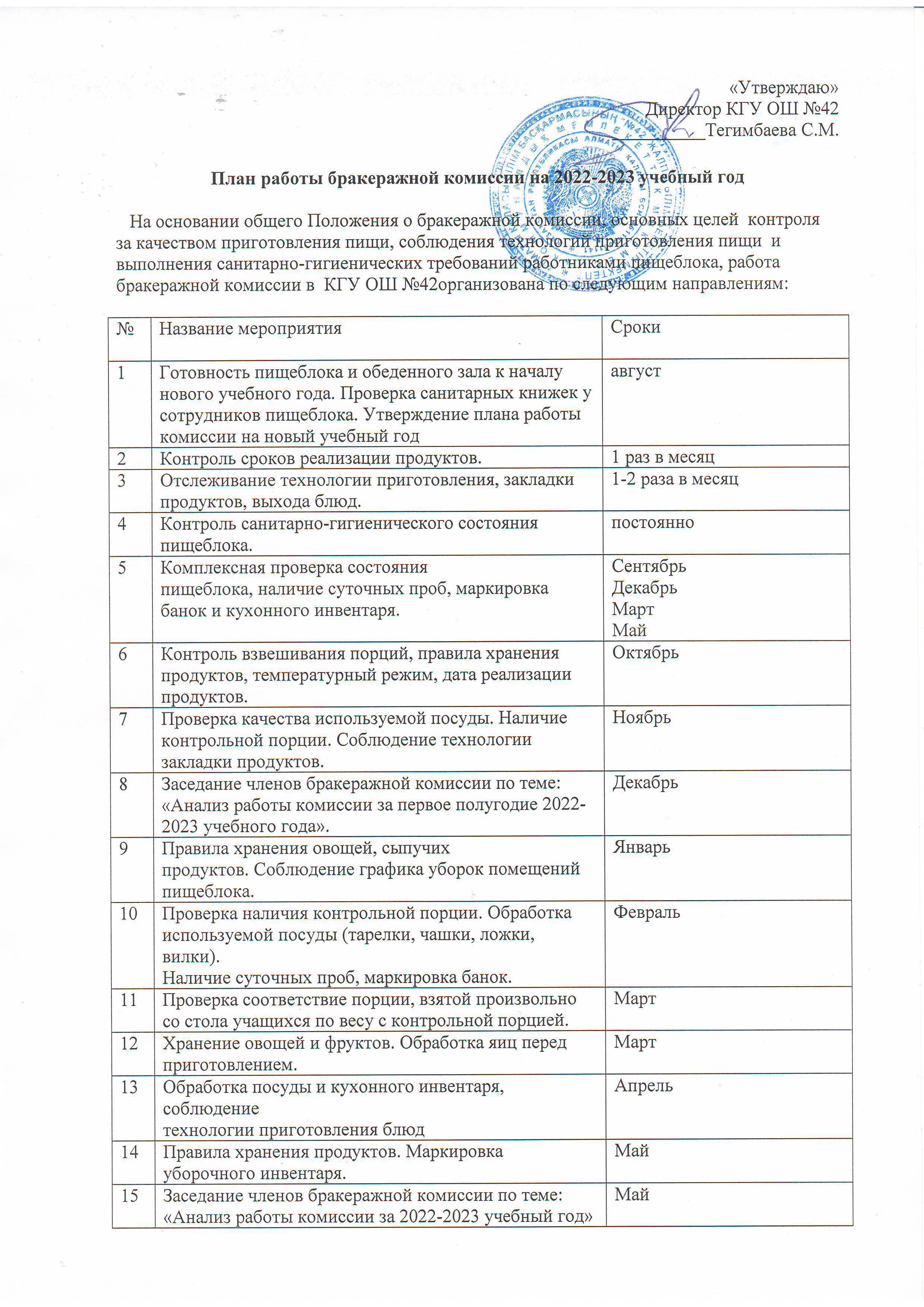 » План работы бракеражной комиссии на 2022 - 2023 учебный год.