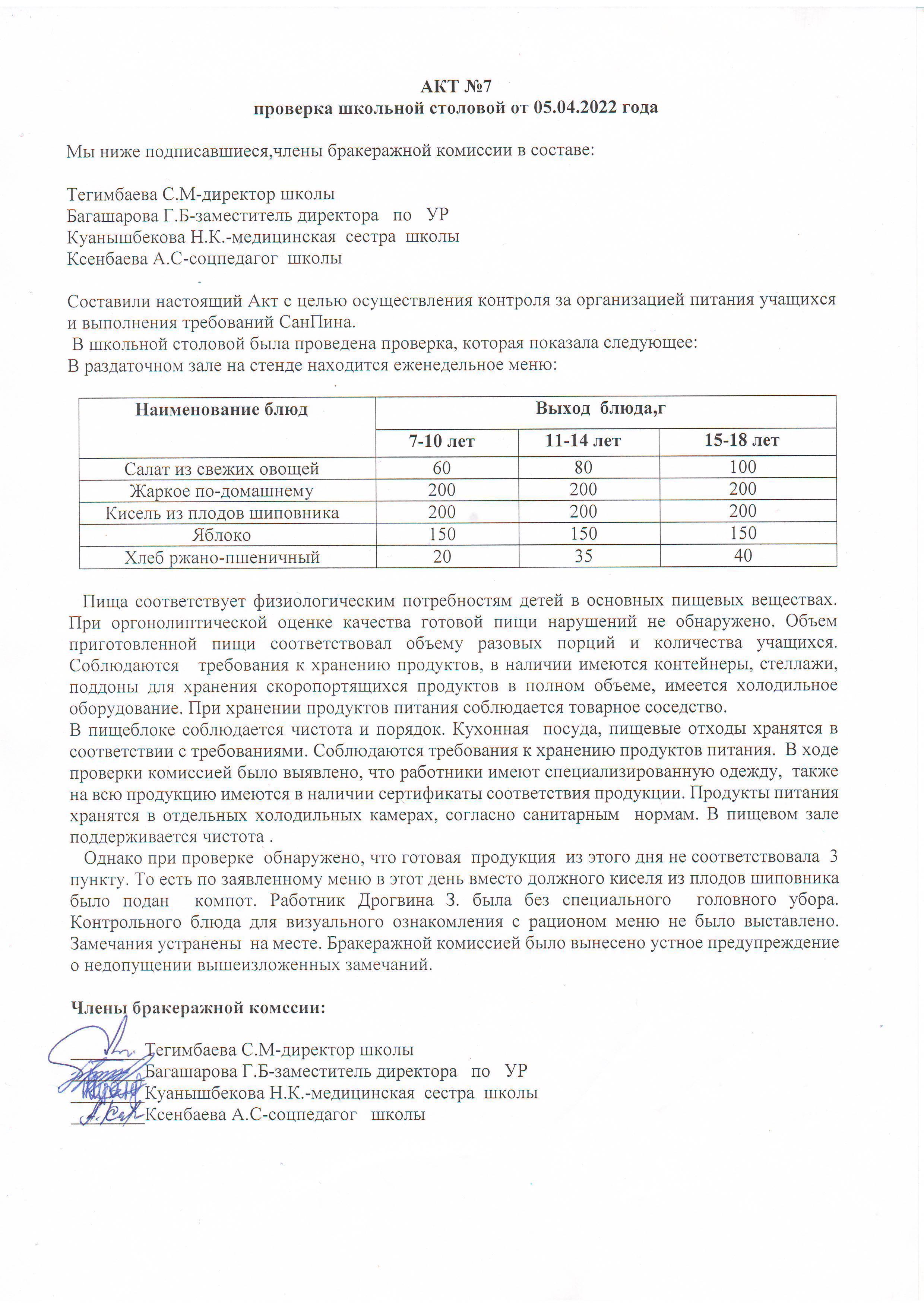 » АКТ №7 проверка школьной столовой от 05.04.2022 года.