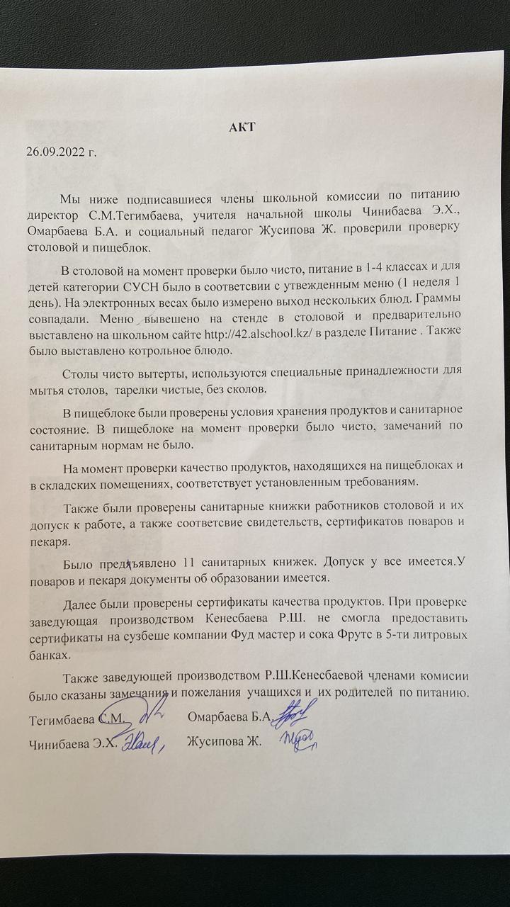 » АКТ №1 проверка школьной столовой от 26.09.2022 года